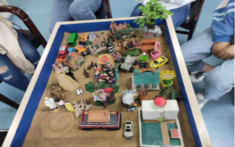 本次心理团体辅导活动以沙盘游戏的形式展开。首先,辅导者和同学们通过简短的自我介绍互相对彼此有了初步的了解和信任,这也为活动的顺利开展营造了轻松的氛围。其次,辅导者介绍了活动规则,同学们进行了随机抽签并按照顺序选择自己喜欢的物件分7轮摆放在沙盘上,最终形成了同学们共同的作品。